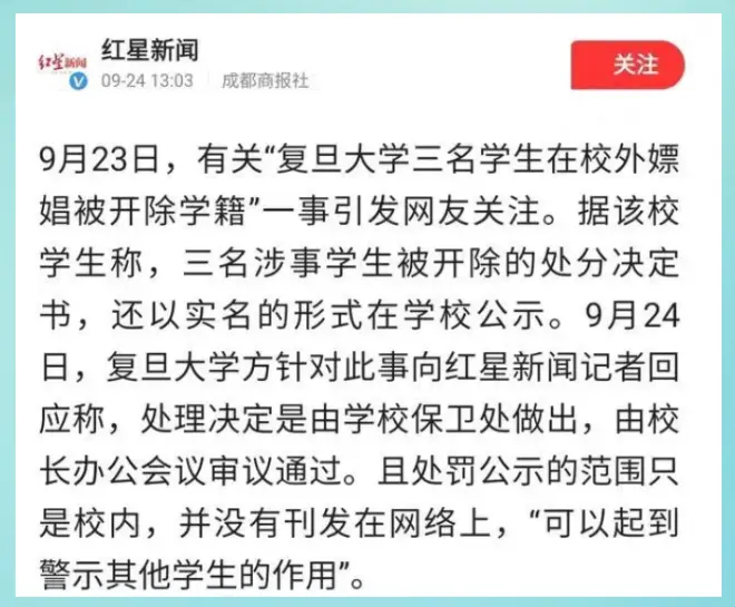 这事,给我的第一感觉就是去年比较火的复旦大学三研究生嫖娼被学校开除的延续,因为近段时间类似的新闻,只有复旦大学出了。