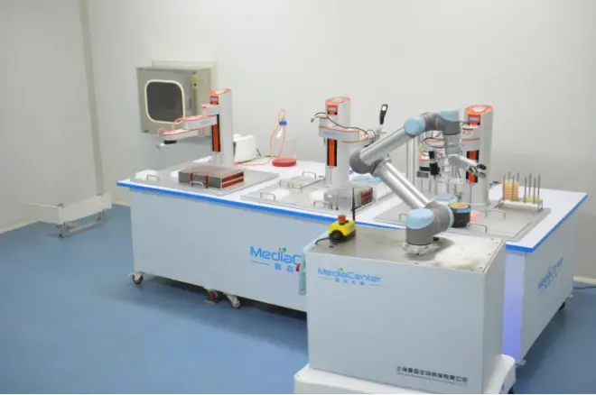 这块我们设计了相应的装备,包括相应的软件实现这个数据的集成管理,有的已经开始销售了,有的还处于方案阶段。比如我们取样之后,通过机器人送到检测室。夜里面取完样以后人不在,便有移动机器人送到检测室,检测室另外的机器人去实现样品的这个检测。包括离心、测OD值、测生化指标,都是可以完全实现无人化的这个模式,包括整合第三方的这种这个检测仪器。