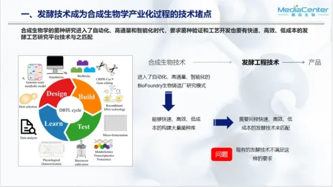 首先,我们合成生物技术在这20多年的发展是进步非常快的,现在基本上可以快速的、高通量的、自动化的、低成本的去实现菌种构建,从过去需要几年几个月缩短到现在仅需几个礼拜就可以实现大量的菌种构建。但是对应的发酵工程技术是一个卡脖子技术没有对应的一个高通量、低成本、自动化这样的技术,所以这一块我们希望能够通过我们的工作来解决一些这样的问题。