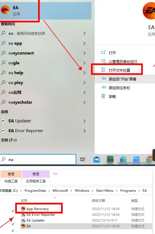 游戏启动失败或服务器启动失败可能是由于应用缓存问题造成的。您可以打开Windows搜索,输入"ea",选择"打开文件位置",然后找到"启动APP RECOVERY",进行缓存清理操作。.