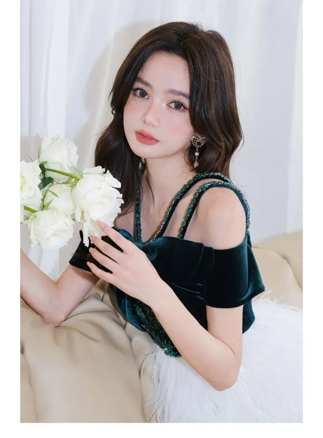 Masion Wester2023春夏新品女绿色丝绒羽毛拼接重工礼服裙连衣裙