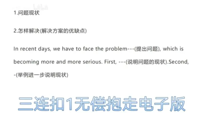 In recent days, we have to face the problem--(提出问题),which is becoming more and more serious.First,---(说明问题的现状).Second-(举例进一步说明现状