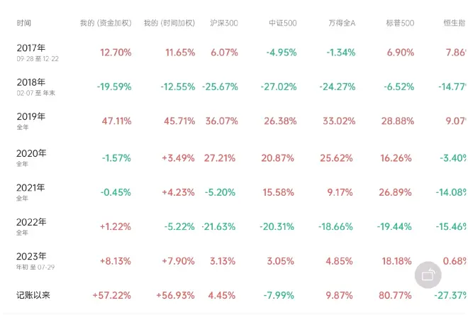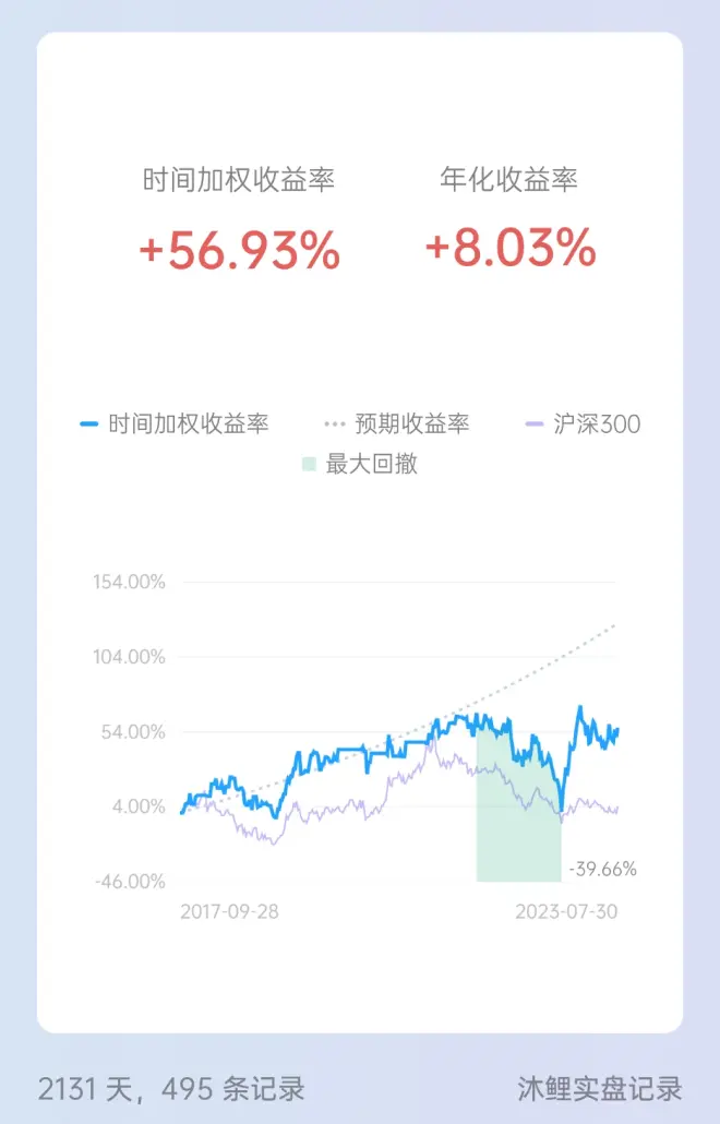 ❹沐鲤实盘2017.9.28~2023.7.28资金加权:57.22%,时间加权:56.93%,年化收益:8.03%,同期沪深300年化收益率:0.75%;
