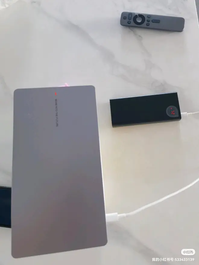 内置电池可以用1小时左右,但十分不爽的是电池模式会强制降低亮度。还好整机功率不到65w,所以可以用充电宝供电,注意一定要选单typeC输出功率65w的。