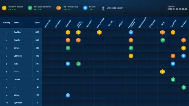 开赛首日,大师赛竞争激烈,仅两小时来自中国台湾的Balsn战队便率先解出题目mirror-universe,斩获整场比赛的“一血”,强势开启“破题”狂潮。紧随其后,来自德国的Eat, Sleep, Pwn, Repeat战队、来自美国的Shellphish战队也纷纷攻破此项题目。而Balsn战队也在大赛首日以590分的战绩摘夺积分榜榜首,Shellphish战队、Eat, Sleep, Pwn, Repeat战队、NeSE战队分别暂居大师赛积分榜第二、三、四位。在第二天比赛中,Balsn战队续写首日战绩,总积分领跑榜单,NeSE战队与Shellphish战同样不甘示弱,紧随其后位列积分榜第二、三位。据悉,NeSE战队曾拿下2019WCTF新锐赛冠军之席直通2020WCTF大师赛,并在此次与其他超强战队激烈厮杀中成功突围,拿下亚军之位。
