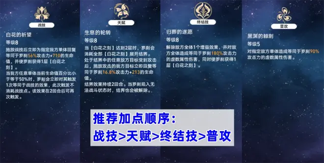 推荐加点顺序为:战技>天赋>终结技>普攻。战技是罗刹治疗的核心,升级能提升治疗量;天赋同理,升级能提升结界的治疗量。终结技虽然也很重要,但是升级只会提升伤害,不会提升解除敌方增益效果的数量,所以先尽量提升战技和天赋的等级,再考虑升终结技。普攻可以不升级。