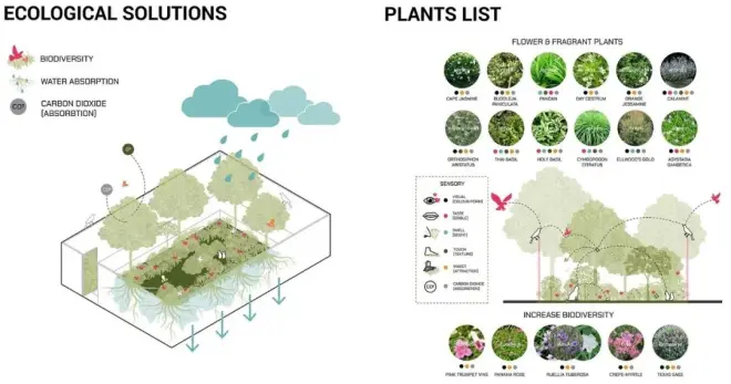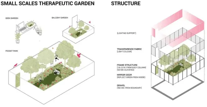 Shma事务所希望创造一个带有“门”的花园空间,用自然的力量来缓解压力。以“疗愈花园”为核心理念,项目最终以口袋公园的形式呈现在大众眼前,旨在为进入这里的游客缓解一天的疲惫与压力。整个花园仅有30%为硬质景观空间,其余70%均为自然植被,自然为主的景观形式意在使人们的身体、心灵以及精神达到一种平衡与稳定的状态,让访问这个花园空间的人通过五感的放松,缓解因快节奏的城市生活方式而积累的压力。