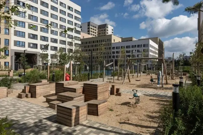 公园设有运动区和健身区,以及5-12岁儿童游乐场,小朋友们可以在沙地或水池中尽情嬉戏,陪同的家长则可以在设有城市家具与露台的休息区休憩。在设计公园的儿童区域时,Brusnika与AFA bureau紧密合作,通过深入调研确定了游乐场设计的八个关键点,包括:运动、游戏、实验、交流、合作、娱乐、自然沉浸以及冒险。这些元素都被一一纳入了公园的儿童游乐区中。游戏设施由落叶松制成,具有多重功能,在这里,孩子们每天都能谱写自己的故事、享受各种各样的活动。根据游乐场分区的不同,地面也采用了不同的材质,包括:草地、露台以及沙地。