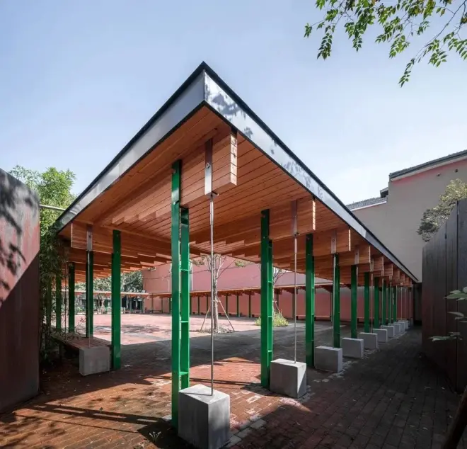 乐山绿地的设计以全长80米的“众乐之廊”为主要空间线索,大跨度轻型结构保证了廊内外视线与行为的通畅,也成为隐现于绿色中的“场所精神(Genius Loci)”的载体。“众乐之廊”不仅在廊下空间结合造景为市民提供了遮阳避雨的趣味休闲空间,也整合了室内共享阅读空间、绿地管理用房等功能,响应了公共空间游憩、社区治理、公共管理等诸多公共议题。