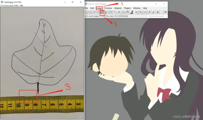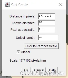 3,analyze>set scale,我选中了10mm距离,就在known distance上面写10,unit of length写mm,勾选global,这里的意思是全图适用,scale: ****pixels/mm表示每多少个像素点就代表1mm。最后OK。