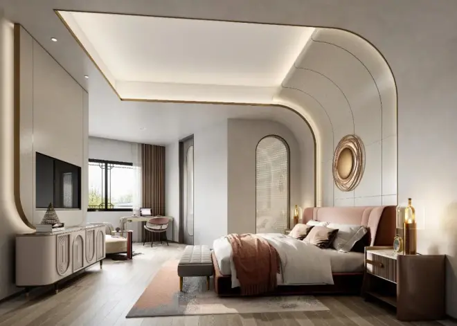 “一卉能熏一室香,炎天犹觉玉肌凉”,主人房能够理解到新中式风格并非完全意义上的复古明清,而是通过中式背景元素的点缀,整体淡雅的配色和空间相得益彰,自然绽放。给人以清凉爽朗、安静静谧的感觉。