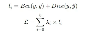 因为GAB操作中需要涉及到不同尺度下的mask信息,所以引入了UNet++的deep supervision操作来计算不同阶段的loss,loss function如上图所述。 Bce:binary cross entropy Dice:Dice loss 权重lambda:1,0.5,0.4,0.3,0.2,0.1对应六个阶段,可以看到第一个阶段的权重是最大的。