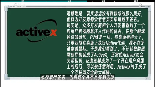 •由于ActiveX理论上能做任何事情,也成为网页病毒的温床,微软为了防止恶意病毒利用其传播,如果你要在网页中嵌入它,必须取得签名。