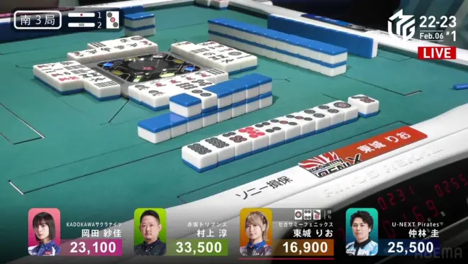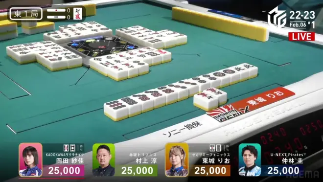 东一局,分数处于后三位的队伍(樱花、赤坂、凤凰)清楚地明白队伍的危险处境。6位樱花的冈田纱佳需要防止队伍被7位的凤凰(东城出场)和8位的赤坂(村上淳出场)偷家。