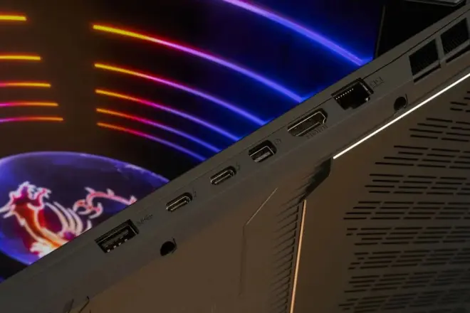 在I/O接口方面,泰坦GT77 HX也是十分齐全。它的I/O接口主要分布在左右两侧。左侧是方形的DC电源接口,两个USB 3.2 Gen 2 Type-A,SD读卡器,3.5mm二合一音频接口,还有电源指示灯。右侧的接口分别是RJ45、HDMI、miniDP、两个雷电4和USB 3.2 Gen 2 Type-A接口。足够多的视频接口意味着它可以实现三联屏及以上的视频输出。