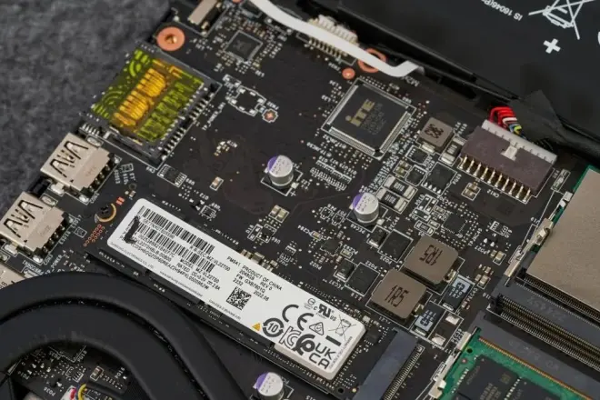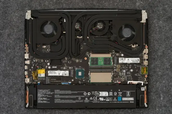 一般来说,现时的游戏本只要有M.2和SODIMM内存插槽各两个,就能够称得上是可扩展性不错了(在这里先不管另外的M.2插槽是2280还是2242、2230规格的)。不过泰坦GT77 HX在这方面还要更进一步,它拥有三条M.2插槽,均为2280规格,其中一条直连CPU,速率可达到PCIe 5.0,剩下两条是PCIe 4.0;至于内存插槽则更是大方,总共有四条。