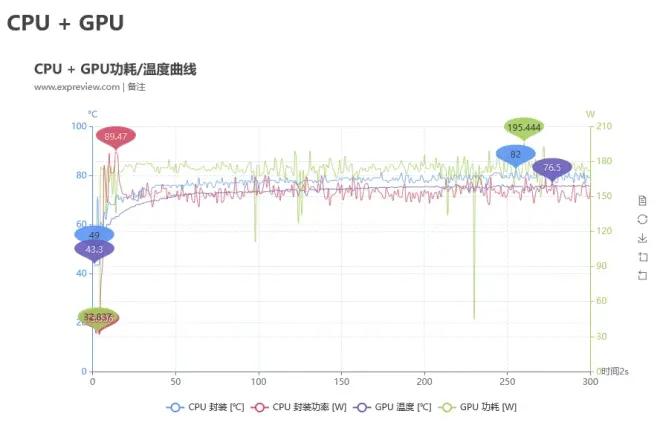 我们采用AIDA 64中的系统稳定性测试-Stress FPU对CPU进行压力测试,Furmark用于GPU压力测试。记录数据采用的是HWinfo。在这里说明一下:它的默认设置为每2000ms(2秒)记录一次,所以图表中的时间单位会显示为2s。我们从记录文件中提取了10分钟的连续数据,因此图标中的x轴显示为300。