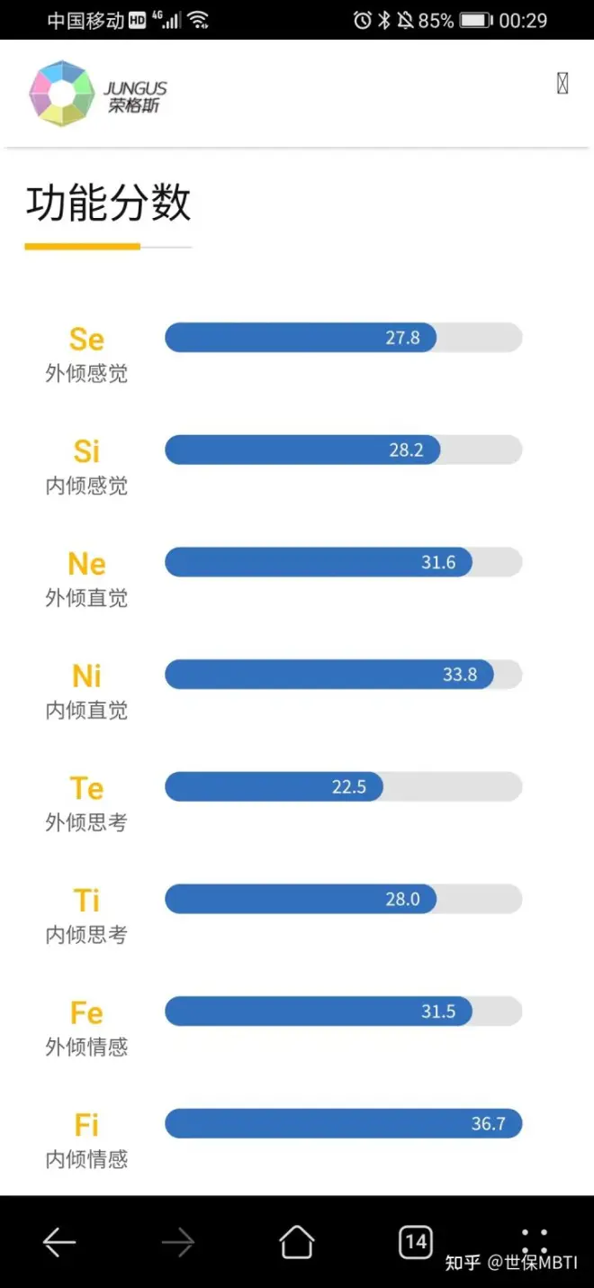 我觉得荣格八维图的数据较好地体现了你的真实性格,也就是说,你在日常生活中没有什么防御而把自己内耗掉,Fi(内倾情感)36.7,Fe(外倾情感)31.5,Ni(内倾直觉)33.8,Ne(外倾直觉)31.6。