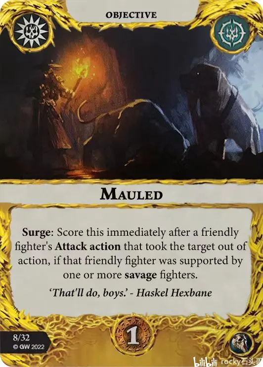 以前3人族或减员之后少于4人的战邦冲锋后最后一个激活只能抽牌浪费导致场面上的弱势。在7.0的主规则的改动后(所有存活友方单位在都有冲锋标志,则还可以继续激活执行攻击行动)全员冲锋的收益相对扩大了。为了做任务,还可以在回合开始阶段主动给自己挂蹒跚来获得狂暴。蹒跚同时也是一把双刃剑,在8.0规则确定后,法术攻击等都可以重投骰子。重投1的强度可以看之前的限卡照顾到了老战帮的各个重投卡。因其任务卡大多都需要进入别人领地,所以爪牙包最适合的是3-4人自身血量足够的杀人族,也能大致确认这包的核心玩法就是有脑冲锋,控制位置保证自己人冲锋后的位置不至于被别人围殴太多支援打死。推荐玩爪牙的战帮,B以上的话可以说囊括绝大多数杀人族,甚至5-6人战帮杀人思路也可以带(点名猎魔人和埃辛鼠人)。不过最适合尖牙的无疑是7.0大包里的野黑奴,吸血鬼,狼骑兵这三割草机和以火K为代表的厚血杀人族。当然玻璃大炮为代表的新DOK和猎魔人也是用尖牙包,可见这套卡组才是目前环境的主要构成部分。下面从任务卡开始一张张介绍尖牙包为什么人人都爱的。