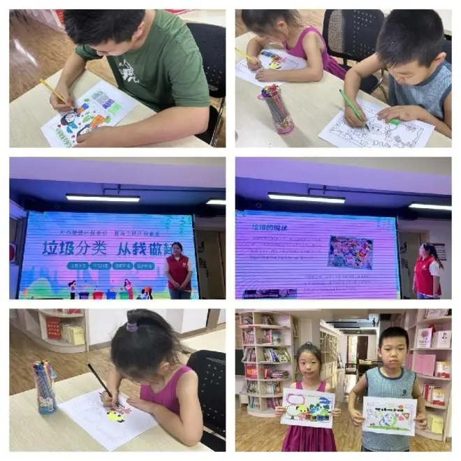 实践团成员们来到社区中,向小朋友们宣讲垃圾分类的相关知识,通过绘画让小朋友们了解垃圾分类的意义,让秦岭更干净,让地球更美丽,提高小朋友们的环保意识。