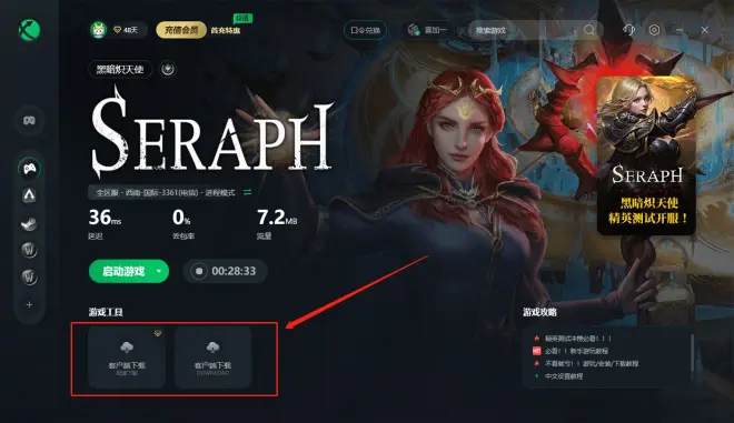 加速器是硬性条件之一,推荐迅游的另一个原因是迅游客户端为我们整理了Seraph黑暗炽天使的一键下载功能。