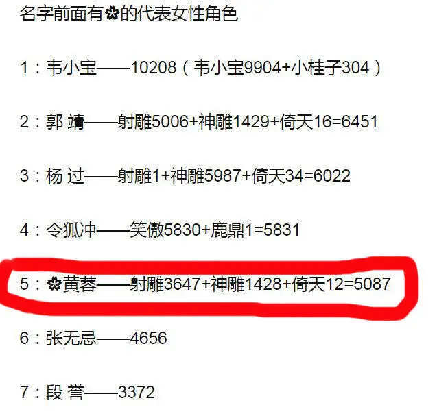 即使是女性角色的排名,也排在方怡的后面,而方怡在原著中连女五女六都算不上。