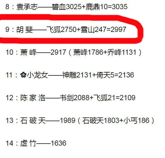 《飞狐外传》的男主角胡斐,在总排行榜上排第九名,戏份甚至高过了萧峰和小龙女,可见他的戏份在原著中有多重。