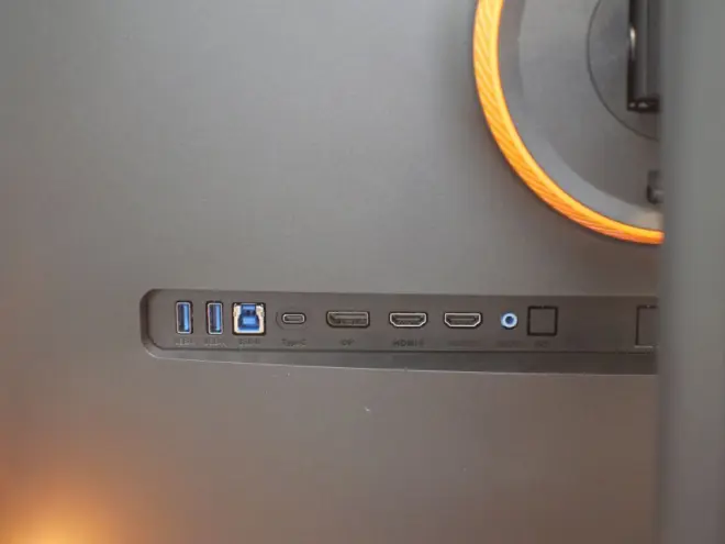 显示器的背面整体算是比较的朴素,为了打破平衡,显示器的背面有一个柠檬黄色的塑料圈,也算是一种电竞风格的元素吧:整个显示器背面的端口也是非常的丰富,2个HDMI2.1+1个DP1.4+2个USB-A3.0+1个USB-B3.0+1个Type-C (90W充电)+1个Audio out。端口的丰富无疑显示了这款显示器的专业性和强大性,这些是传统显示器无法比拟的。
