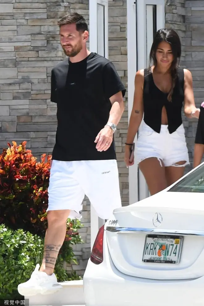 照片中的梅西黑白穿搭,既酷,又帅,老婆和他一样,黑白穿搭,既性感,又漂亮,一前一后一起出门。