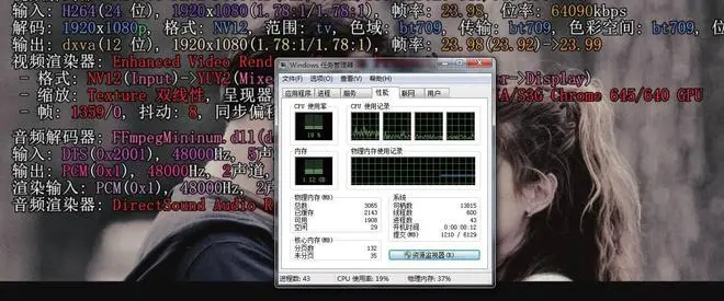 ▲借助硬件解码功能,这两台兆芯PC播放高码率1080p视频时的CPU占用率都很低。