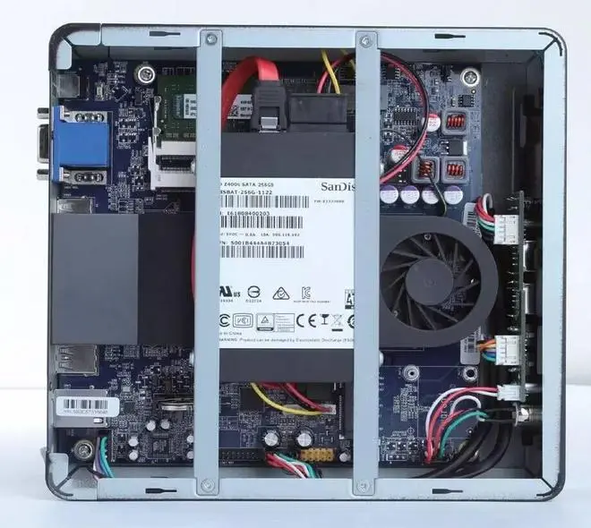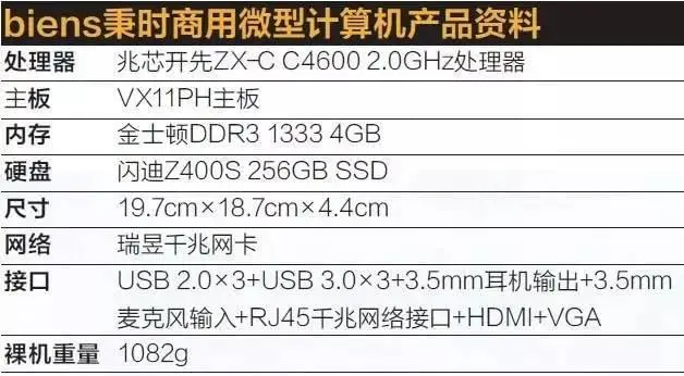 ▲biens秉时微型计算机由上海仪电智通信息技术有限公司推出,其内部由一块Mini-ITX主板搭载风冷主动散热设备,以及集成在板上的兆芯开先ZX-C C4600 2.0GHz处理器、4GB金士顿DDR3 1333 SO-DIMM内存、闪迪Z400S 256GB SSD等各类配件与板载芯片组成。