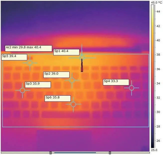 ▲联想昭阳CF03笔记本电脑同样采用超低功耗的兆芯开先ZX-C C4600处理器,图为其在运行40分钟BurnInTest V8.1 Pro烤机测试时,笔记本的C面最高温度只有40.4℃,且位于键盘上方处,C面平均温度为35.2℃,发热量很低。