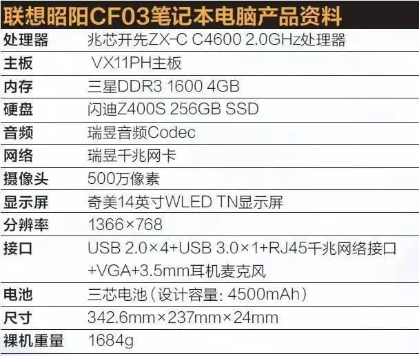 联想昭阳CF03笔记本电脑则是为那些需要移动办公的政府机关人员设计的——虽然不是全高清屏,但14英寸显示屏的配置,再加上较大的字体,能让用户长时间处理办公文件时在视觉上更加轻松。低功耗的兆芯处理器辅以4500mAh的电池,理论上应该能提供足够的续航时间。同时其裸机1684g的重量也不算高,携带起来较为方便。那么,这两台PC在实际应用中的表现到底如何呢?