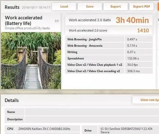 我们还通过PCMark8的Work工作电池测试,测试了联想昭阳CF03笔记本电脑在进行办公应用时的续航时间。测试结果令人较为满意,联想昭阳CF03笔记本电脑在进行办公应用时的续航时间可以达到3小时40分钟,基本上可以满足用户进行一个上午或下午的连续工作。