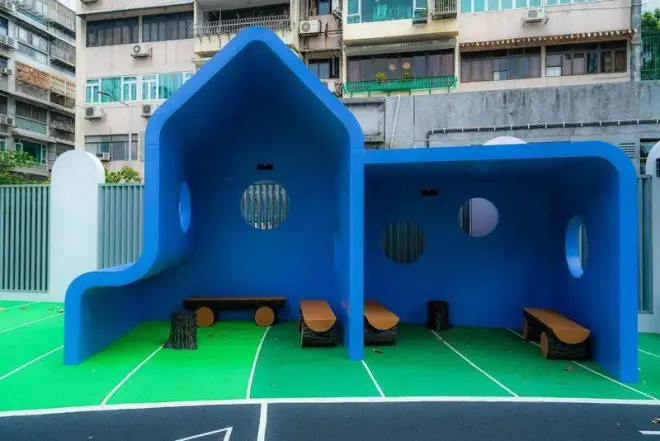 周围设有小型音乐和知识性游乐设施,丰富环境中的感觉讯息,提升儿童的感觉统合能力。场内铺设无缝安全地垫,设有室外洗手池,部分座位造型围绕树木,绿植布局与设计主题融合。靠近入口处设有可遮阳避雨的休憩等候区,供家长休息。