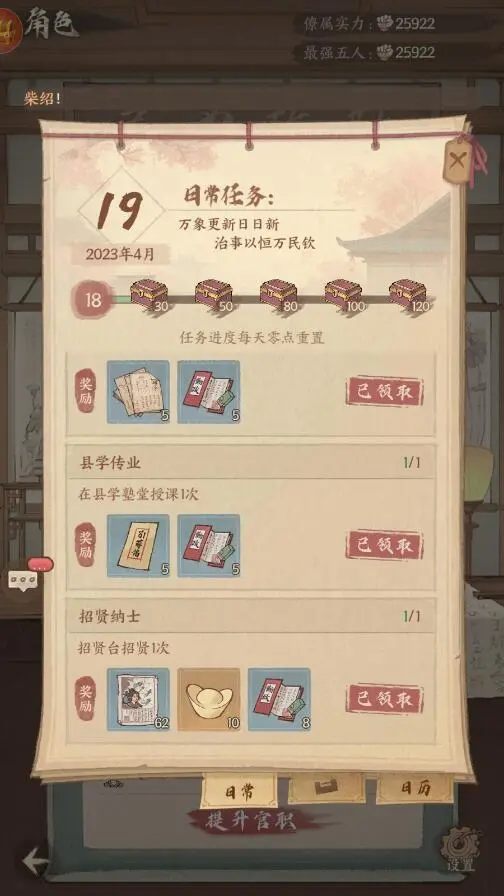 5、解锁了日常玩法之后,按照要求完成相应的县学传业、招贤等任务也可以获得升级经验奖励