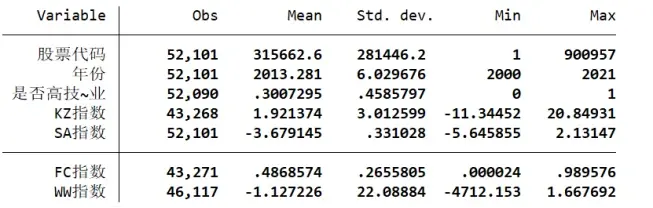 3、指标说明:股票代码、年份、行业名称、行业代码、所属省份、所属城市、是否高技术产业、KZ指数、SA指数、FC指数、WW指数