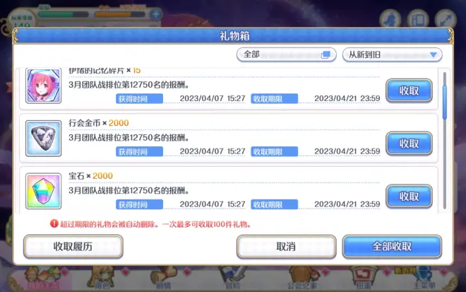 昨天下午发的上月公会战工资。宝石跟5000名没差多少,主要是公会战币。
