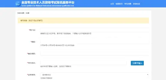 *用户名:请填写5至20位字母、数字或下划线组合,不要输入汉字或其他符号*密码:大写字母+小写字母+数字的8至15位字符组合*确认密码:再次输入设置的密码*考生姓名∶姓名中间不要输入空格,注册后不得修改*证件类型∶注册后不得修改*证件号码∶ 注册后不得修改