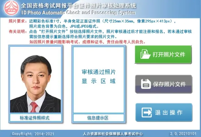 近期彩色标准1寸,半身免冠正面证件照(尺寸25mm*35mm,像素295px*413px),照片底色背景为白色,JPG或JPEG格式。(2018年2月22日以前注册的用户无须更换照片)。