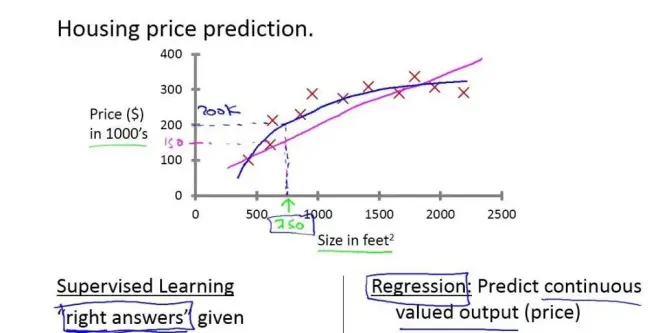 我要定义可能是最常见一种机器学习问题:那就是监督学习。我将在后面正式定义监督学习。我们用一个例子介绍什么是监督学习把正式的定义放在后面介绍。假如说你想预测房价。前阵子,一个学生从波特兰俄勒冈州的研究所收集了一些房价的数据。你把这些数据画出来,看起来是这个样子:横轴表示房子的面积,单位是平方英尺,纵轴表示房价,单位是千美元。那基于这组数据,假如你有一个朋友,他有一套 750 平方英尺房子,现在他希望把房子卖掉,他想知道这房子能卖多少钱。那么关于这个问题,机器学习算法将会怎么帮助你呢?