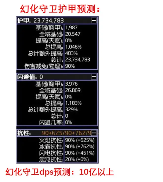 利用武器天赋树中的霸体(幻化守卫装备时有效)构成类似护甲人的高护甲幻化守卫bd,人物辅助充当光环师(输出和光环分离,装备相对容易做),并用烈焰羁绊与幻化守卫链接,可提供幻化守卫2000火点伤,另外可以把药剂应用于羁绊对象(武器天赋树),从而预测能达到接近2400万护甲的幻化守卫,幻化守卫的dps高达10亿以上(即使只是平砍)。