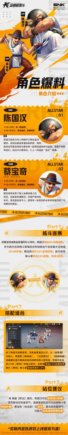 经纪人好呀!大家一直期待的金家潘前段时间已经上线,现在他的两个徒弟陈国汉和蔡宝奇也将来到【格斗之城】,陈国汉一直被SNK粉丝列位系列作品恶人之首,他的搭档蔡宝奇自然也不相上下,两人境遇相差不大,如今二人组成搭档以全新SSR身份来到【格斗之城】,各位经纪人又将如何应付?