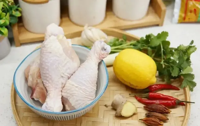 鸡腿3个,柠檬1个,香菜3根,小米椒2根,大蒜5瓣,大葱半根,姜1小块,栀子3颗。