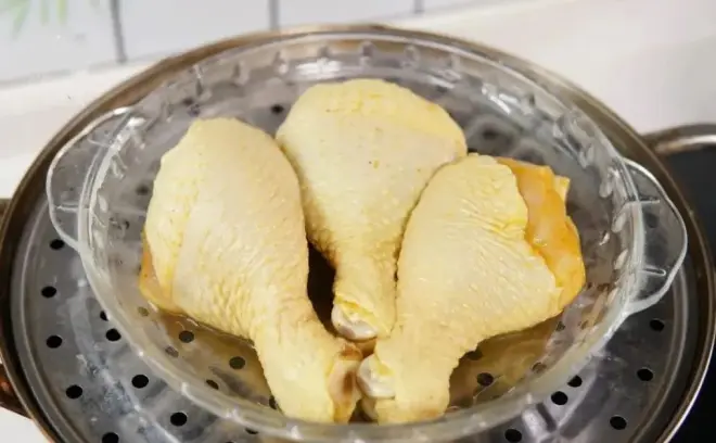 3、蒸锅中加入适量水,腌好的鸡腿去掉配料,放入蒸锅中蒸30分钟。