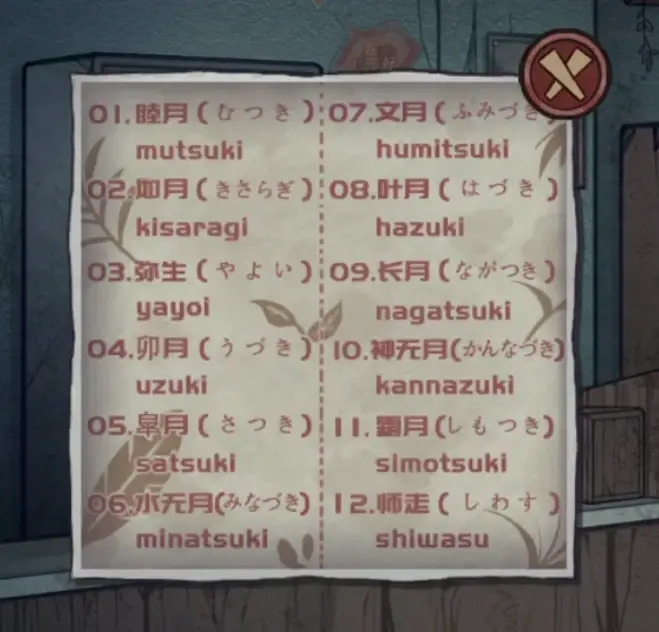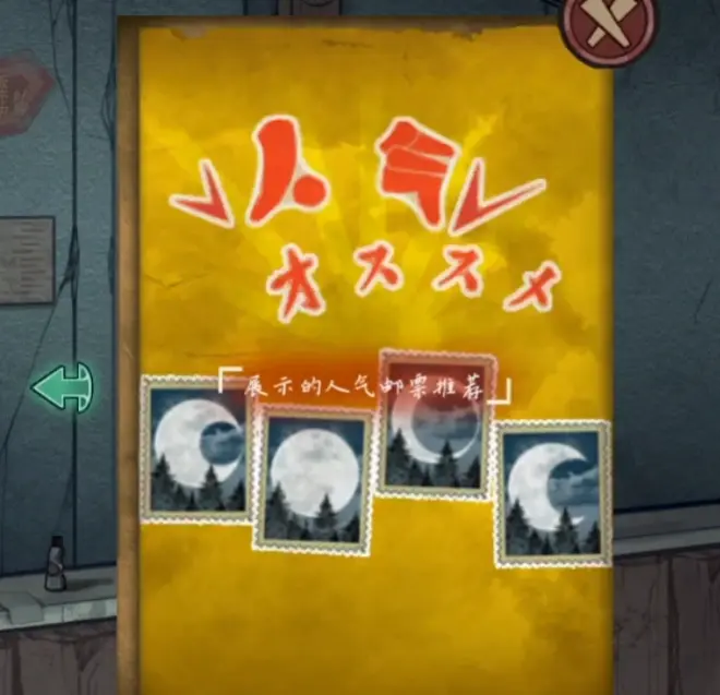 开门后进入铁门,剧情过后直接来到邮局,外面没有什么可以调查的直接进入邮局,多层小柜子的左边吸着一个绿色小人的吸铁石拿走,柜子调查一下拿到一张明信片需要贴邮票盖邮戳,右边的墙上有十二个月的名称读音,后面要用到先注意一下,原来二月就叫做如月啊。