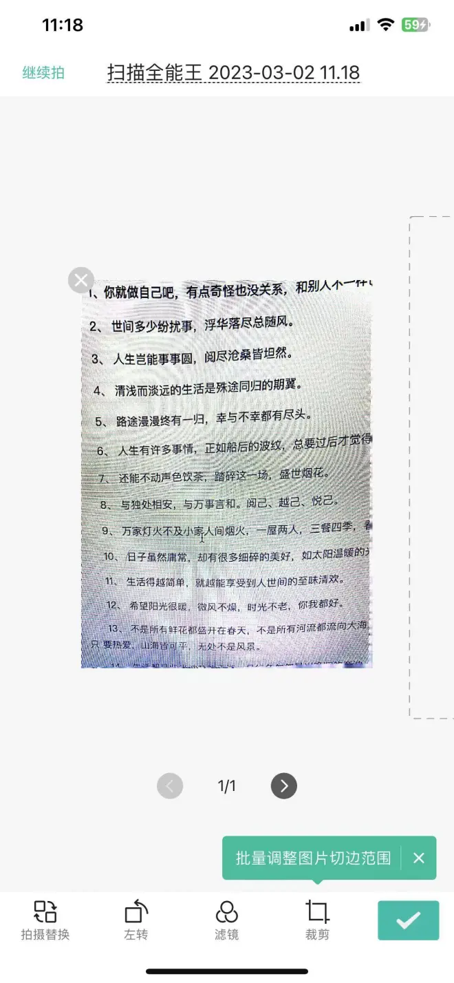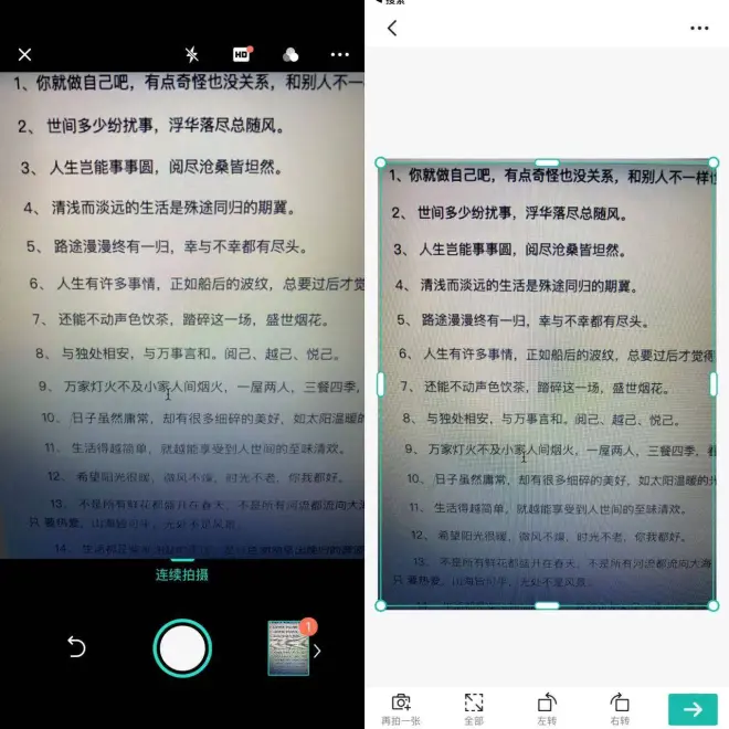 第二步,利用图片右下角的相机拍照,或者直接点击右上角从手机相册中导入图片。拍好照片后,可以拉动八个圆点,选择你要的段落,然后打钩。