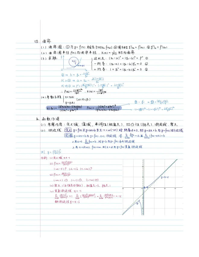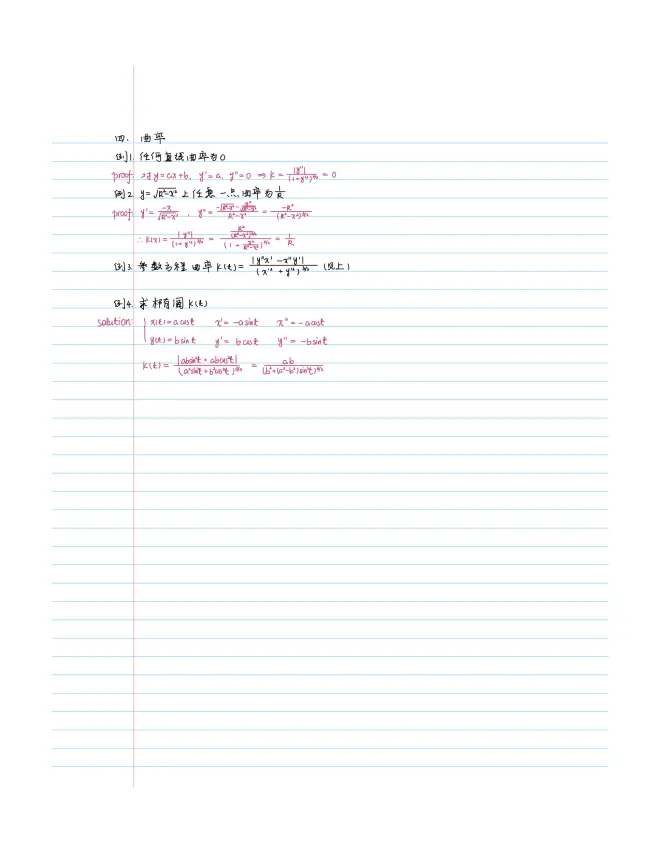 曲率半径部分与普物联系紧密,书中给出了直角坐标方程和参数方程的曲率公式,其实更便捷的方法可以利用物理学,假设一个沿x方向匀速直线运动,进行va分解后利用加速度公式计算曲率半径。同样的方法还可以导出极坐标中曲率半径函数表达式!