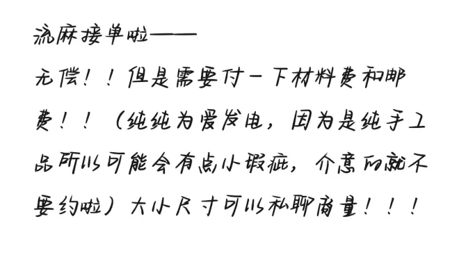 就是说饱饱们可以来找我定流麻捏,是无偿的!尺寸什么的可以私聊我!但是需要自己付一下材料费还有邮费(纯纯为爱发电,因为是纯手工制品所以可能有点瑕疵但是努力减到最小,介意的宝宝们就不要定啦)