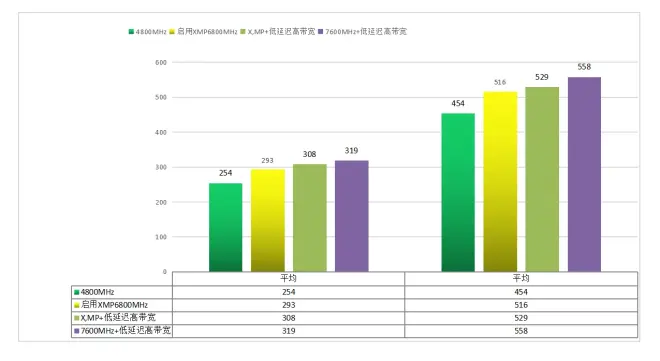所以最后是四个状态的测试结果,分别是4800MHz,开启XMP6800MHz,开启XMP6800MHz+开启主板低延迟高带宽功能,手机超频7600MHz+开启主板低延迟高带宽功能。